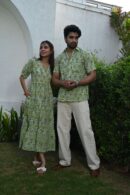 This light green couple matching outfit includes a women?s flowy cotton midi dress and a men?s short-sleeve printed shirt. Designed with cheerful yellow floral prints, this set is perfect for summer outings, casual gatherings, or twinning on vacations.